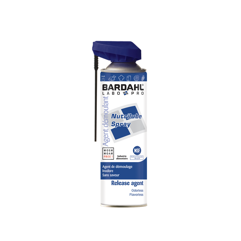 Le Nutrilube spray est utilisé comme agent de démoulage (3H) sur les grils, les fours, les moules à pain, les bancs de désossage, les planches à découper et d'autres utilisations à contact alimentaire intensif pour empêcher les aliments de coller pendant le process de transformation.